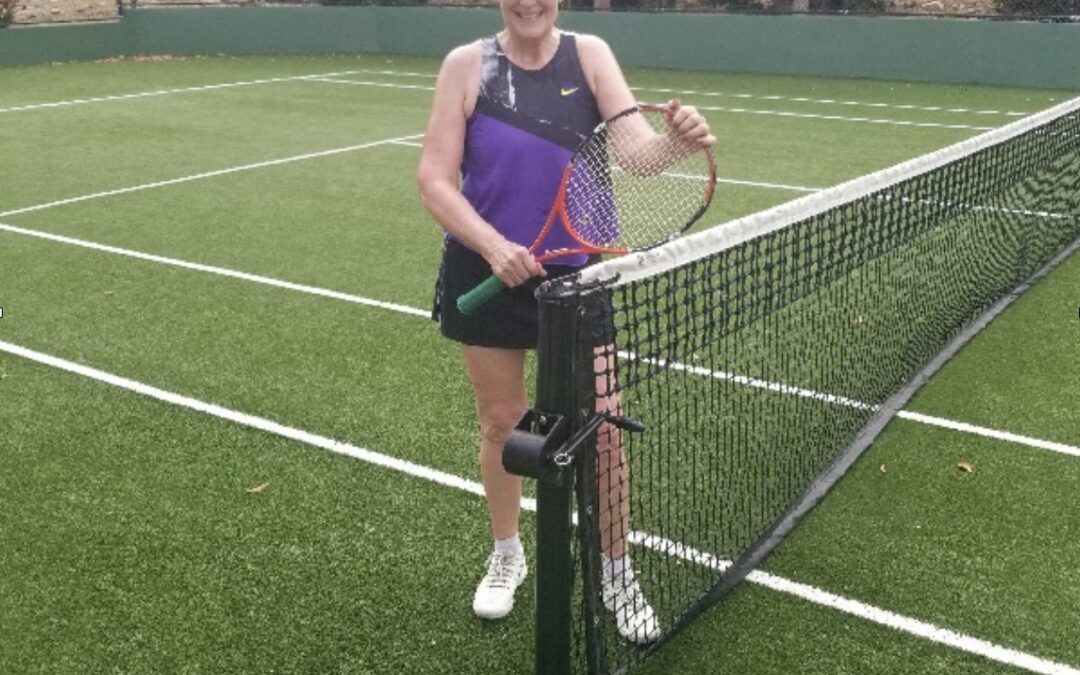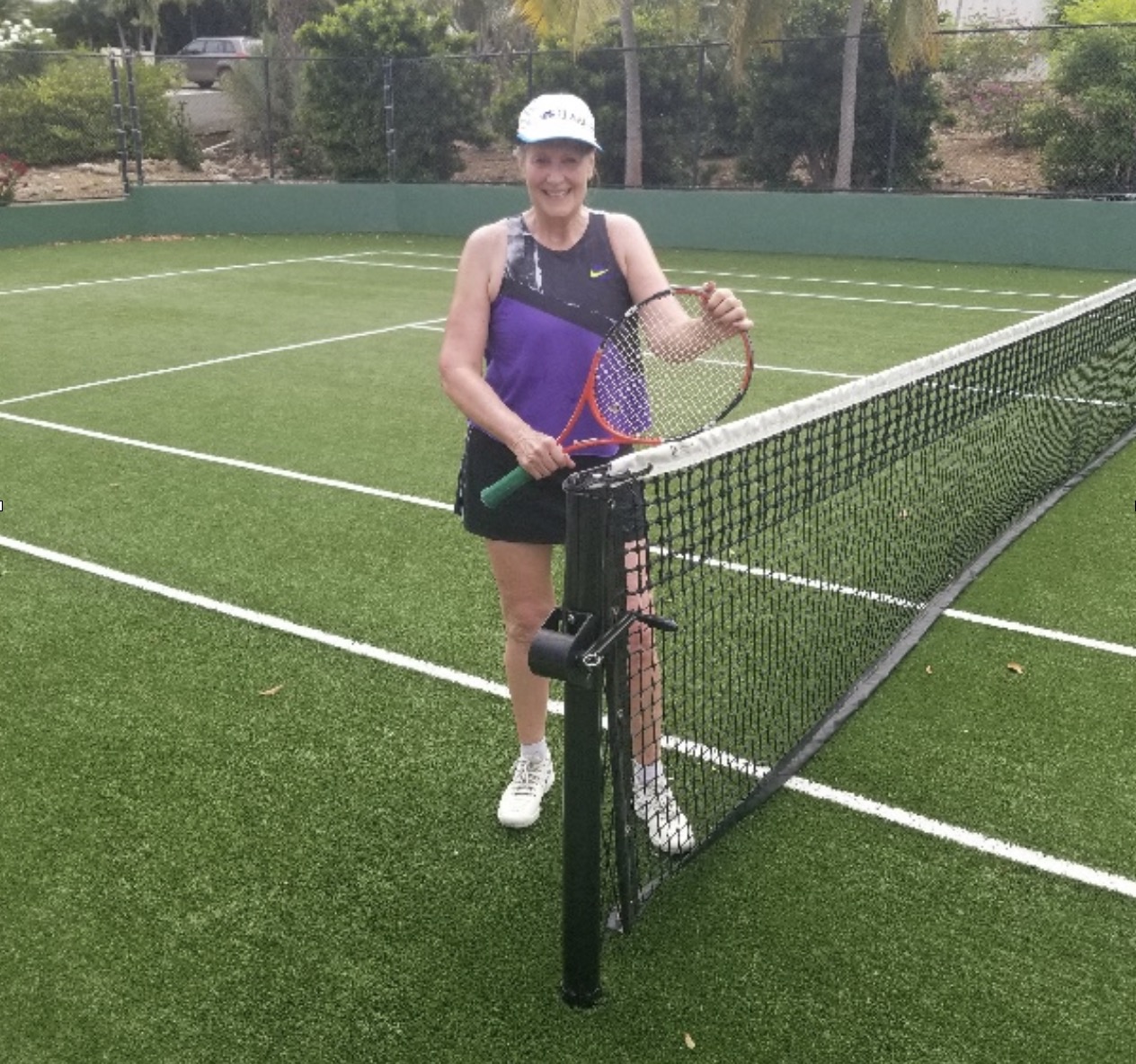 Smiling woman holding a tennis racket on the Mahoe Bay community tennis court in Virgin Gorda, British Virgin Islands, standing near the net on a lush green artificial turf court.