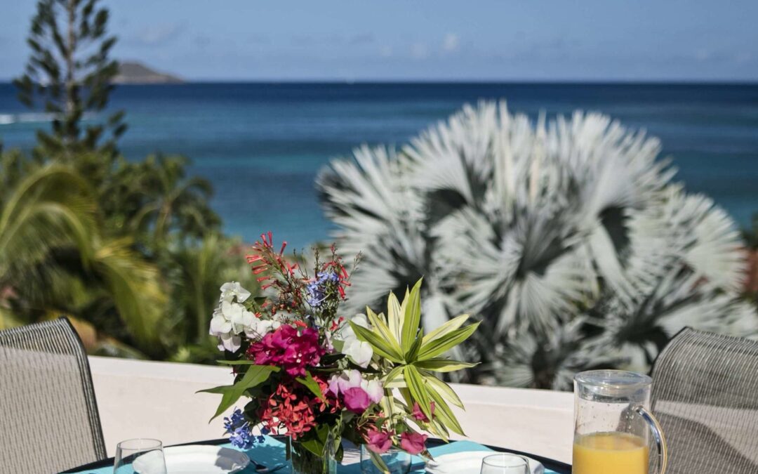 Experience luxury and relaxation with this beautifully arranged outdoor dining setup. The table is adorned with vibrant blue placemats, elegant white plates, and sparkling glassware, complemented by a colorful floral centerpiece. A refreshing pitcher of orange juice adds to the inviting ambiance. In the background, lush tropical foliage and a breathtaking ocean view create a serene and picturesque setting, perfect for enjoying a meal in paradise.