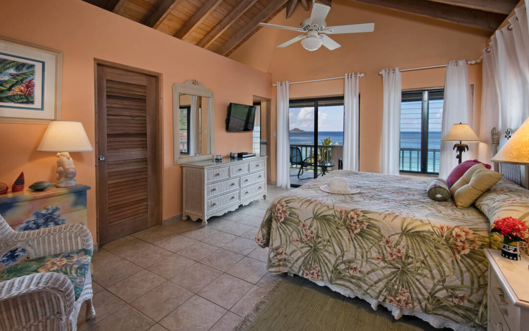 Wake up to breathtaking ocean views in our luxurious guest room at Adagio Villa Resort. This inviting space features warm orange walls, a plush bed adorned with tropical bedding, and large windows that offer panoramic views of the turquoise waters. With its high ceilings, wooden beams, and cozy ambiance, this room is the perfect retreat for those seeking relaxation and natural beauty in our tropical paradise.