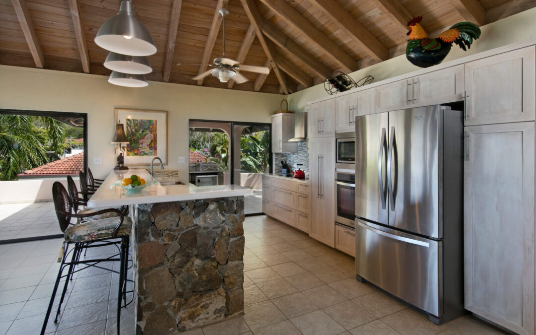 Experience the perfect blend of modern design and tropical charm in this luxurious kitchen. The space is characterized by sleek white cabinetry, a striking stone island bar with built-in seating, and high-end stainless steel appliances. Large glass windows and sliding doors provide breathtaking ocean views, creating a seamless indoor-outdoor connection. The open ceiling with exposed beams adds warmth and character, while pops of color from fresh fruit and decorative accents enhance the inviting atmosphere.