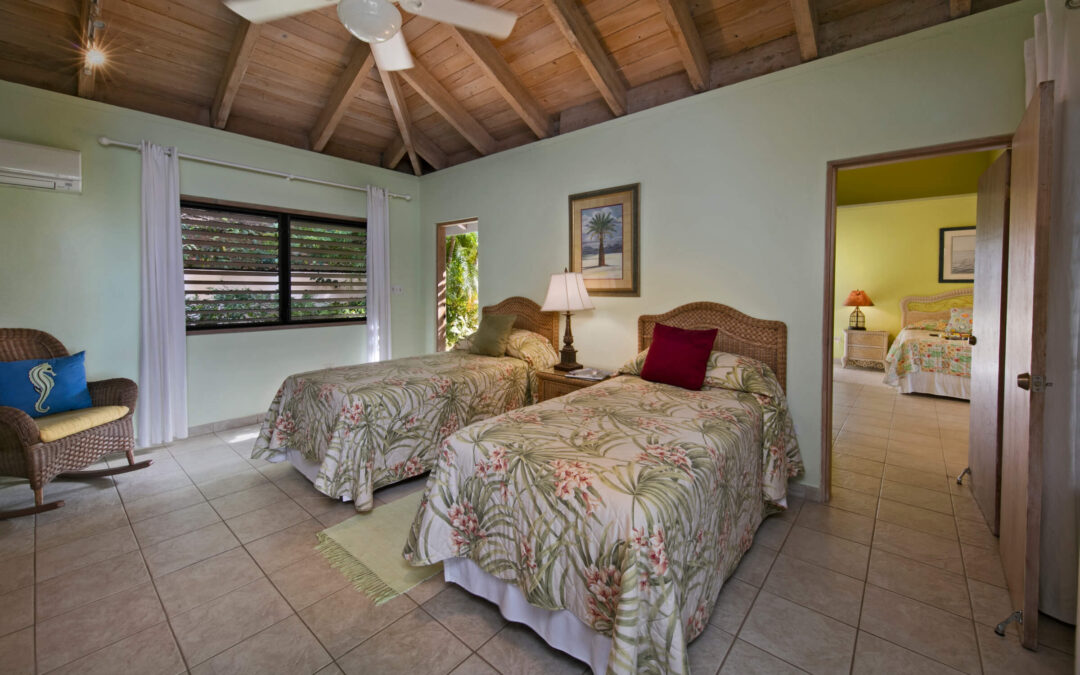 Experience ultimate relaxation in our beautifully designed tropical guest rooms at Adagio Villa Resort! This inviting space features two plush twin beds adorned with vibrant tropical bedding, a comfortable armchair for lounging, and warm, ambient lighting that creates a serene atmosphere. With its high ceilings, wooden beams, and views of lush greenery, this room is the perfect retreat after a day of adventure. Book your stay today and enjoy the comfort and charm of our luxurious accommodations.